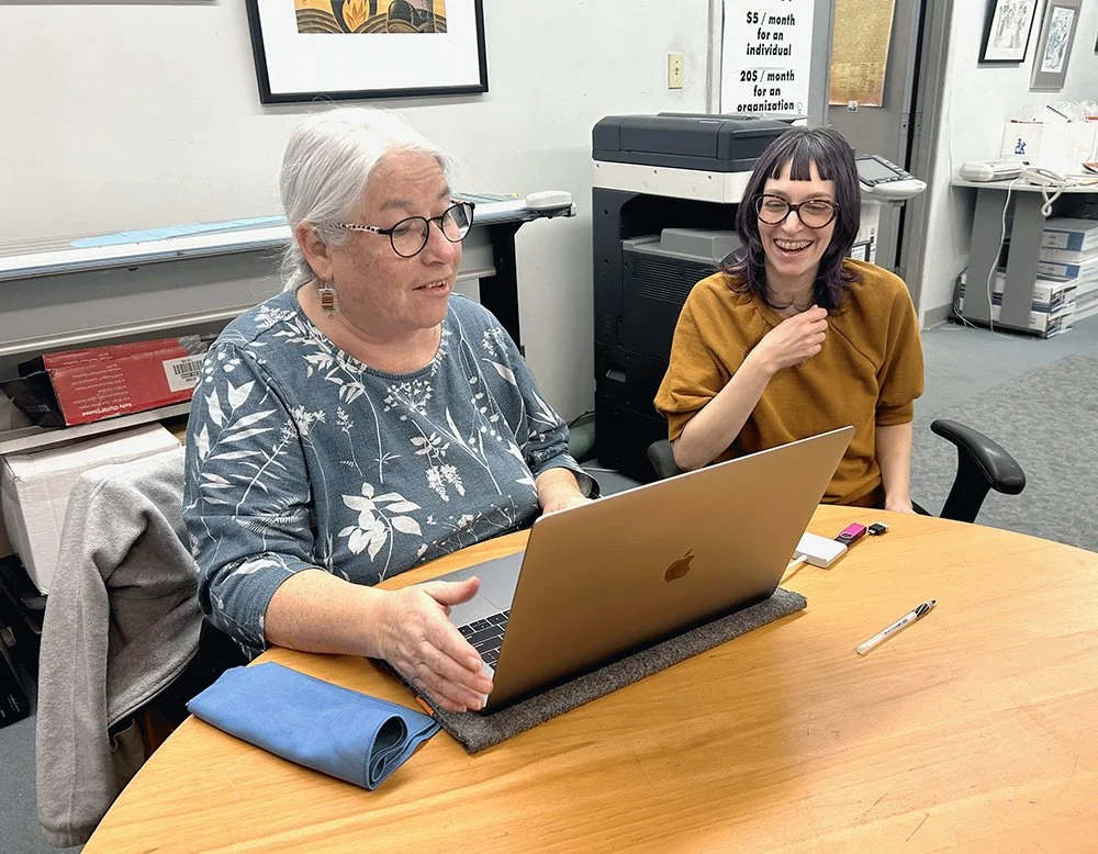 A photo of 2 BAAP volunteers, one a professional graphic designer teaching the other volunteer how to make a colorful flyer.