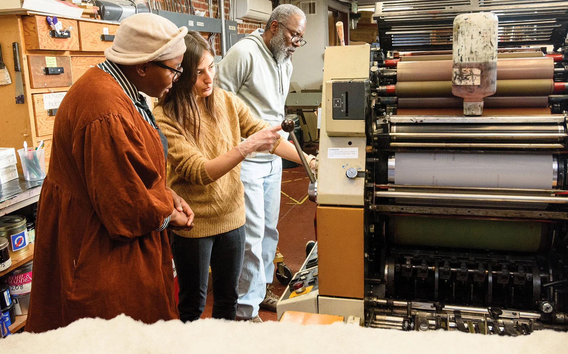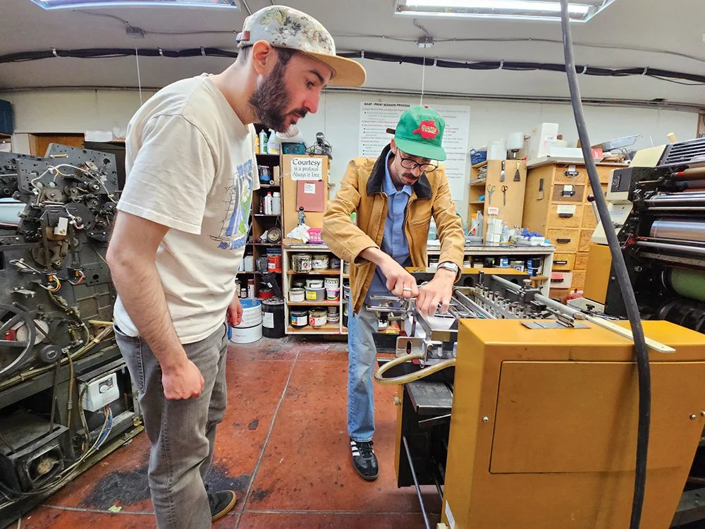 Two BAAP volunteers adjusting the paper guides on BAAP's Ryobi offset press before printing.